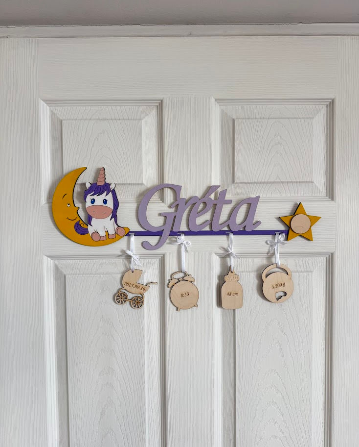 Unikornis névtábla a baba születési adataival